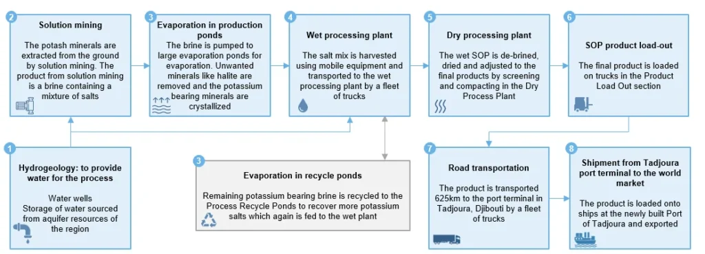 The brine is pumped to large evaporation ponds for evaporation. Unwanted minerals like halite are removed and the potassium bearing minerals are crystallized